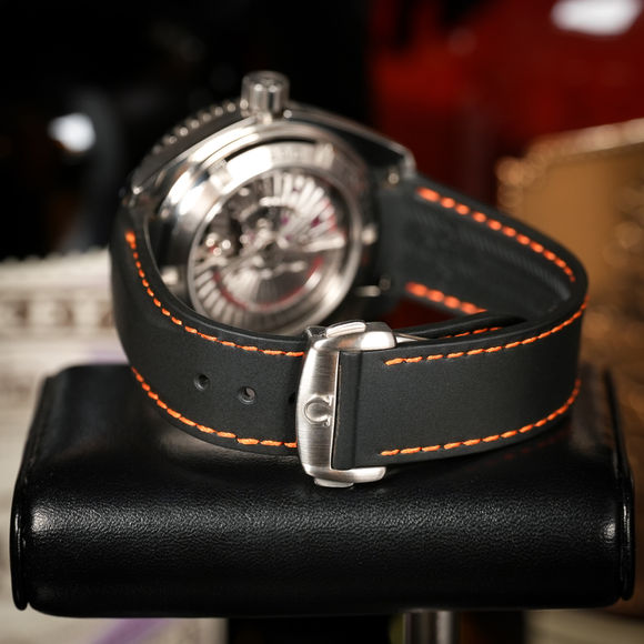 The dial features large applied indices and broad arrow hands filled with Super-LumiNova for excellent legibility in low light. Inside is Omega’s Co-Axial Caliber 8500, an in-house automatic movement offering a 60-hour power reserve and visible through the sapphire exhibition caseback, showcasing the brand’s signature Co-Axial escapement and modern finishing.