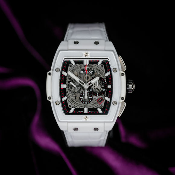 The Hublot Spirit of Big Bang White Ceramic Chronograph is a striking statement piece that blends cutting-edge design with bold engineering. Housed in a 45mm satin-finished and polished white ceramic case, this chronograph stands out with its skeletonized dial, showcasing the intricate inner workings of the HUB4700 automatic movement.